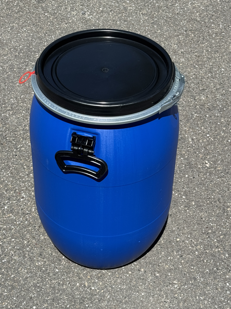 Fût bleu de 60 litres avec couvercle et cerclage.